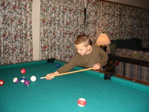 Seth shooting some pool at a vacation house.